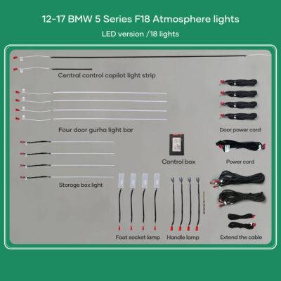 - 18 lights (4-door handle light, 4-door outline light bar, 4-door storage box light bar, 4 footwell lights, 1 central control co-driver through, 1 main driver)