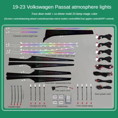 - 18 lights (4 door handle lights, 4 door outline lights, 4 door storage box lights, 4 footwell lights, 1 left of the steering wheel, 1 below the screen).