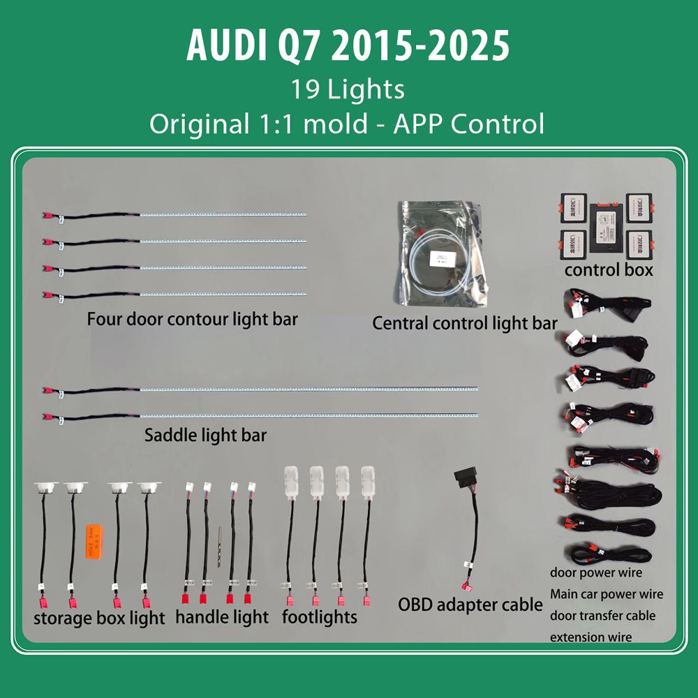 - 19 lights (4 door handle lights, 4 door outline lights, 4 door storage box lights, 4 footwell lights, 2 saddle lights, 1 central control)